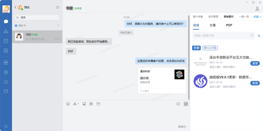 員工在企業(yè)微信工作臺接待,會話過程中接待人員可推薦員工名片,引導客戶加好友。